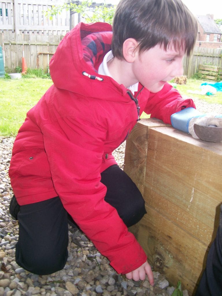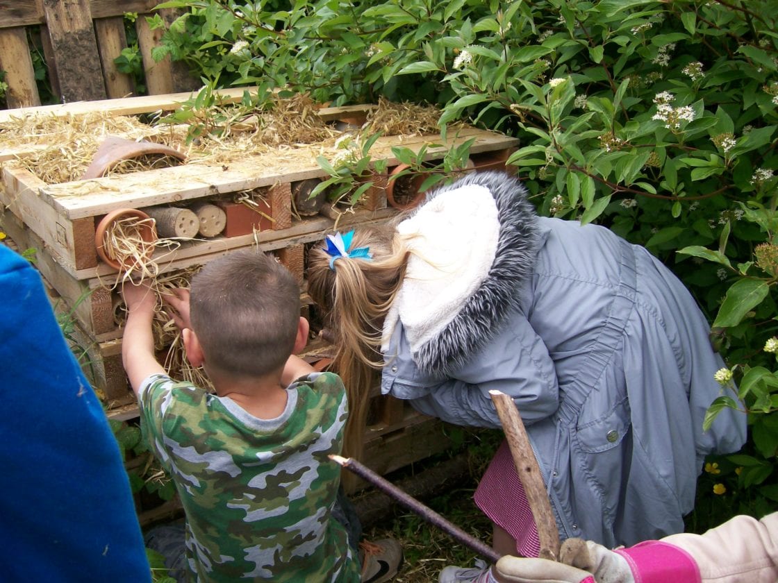 The children are hoping to attract all sorts of pollinating insects to take up residence in the plush accomodation. As you can see from the photographs they had lot’s of fun working together outside creating the structure and tending to their wildlife garden!